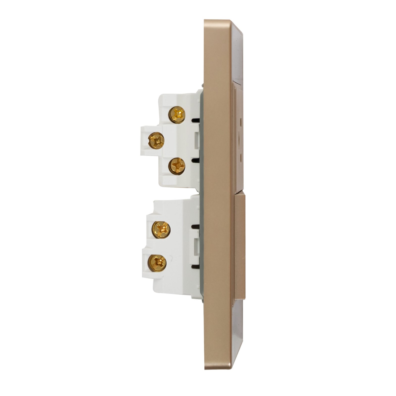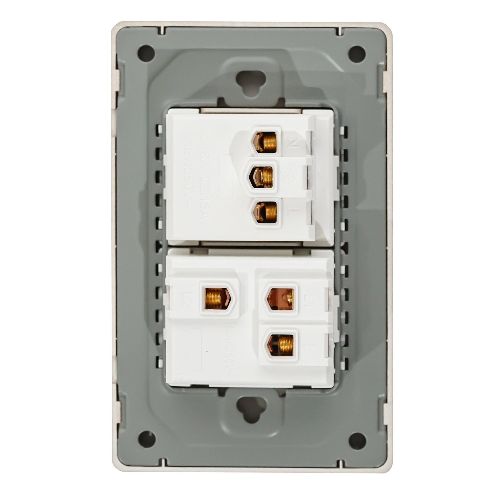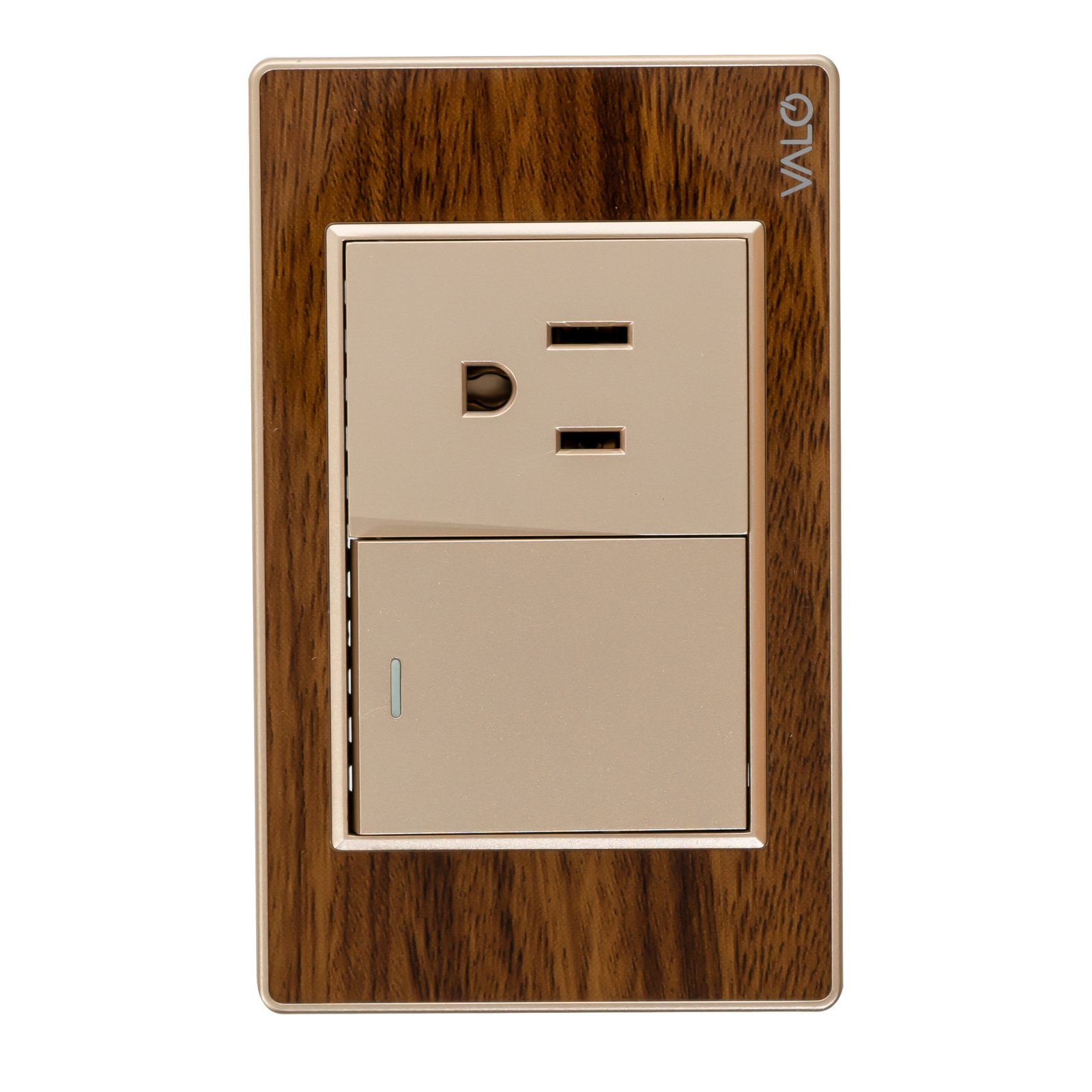 PLACA CON 1 INTERRUPTOR DE ESCALERA Y 1 CONTACTO DE 1.5 MODULOS COLOR MADERA